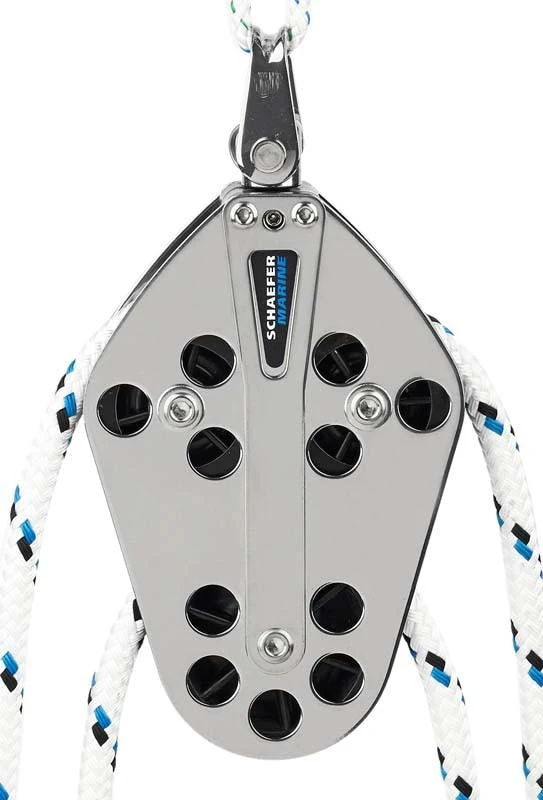 Fiddle block with stainless steel cheeks. Works with 705-75 for a 4:1 purchase. Delrin™ sheaves feature a single top sheave and two in-line sheaves to spread the load reducing friction and chafe. Swivel head design may be locked in place to avoid twist.